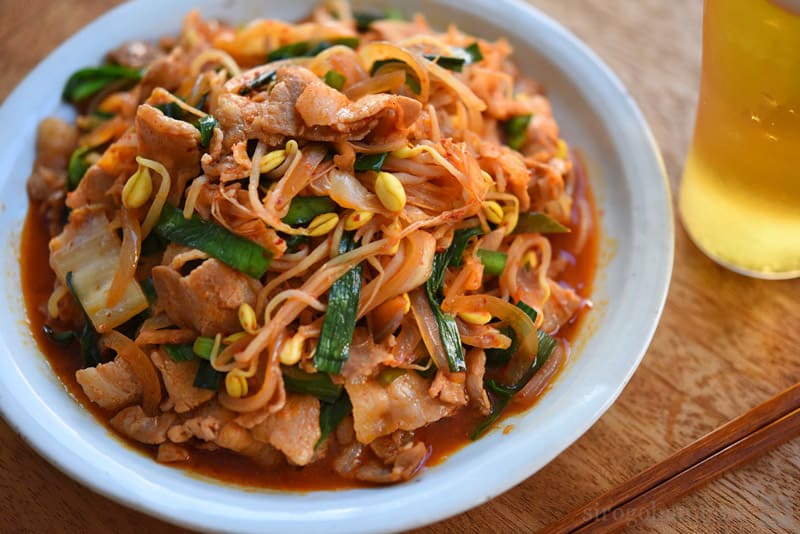 불을 강불로 올리고 숙주나물과 양파를 넣는다. 양파에 불이 통하면 간장과 후춧가루로 밑간을 한다. 수분이 많이 생기지 않도록 재빠르게 볶는 것이 포인트다. 약불에서 천천히 볶으면 채소에서 물이 나와서 돼지고기 김치볶음이 국물 요리처럼 된다. 강불에서 짧게 볶아야 채소의 아삭한 식감이 살아난다. 1~2분이면 충분하다.